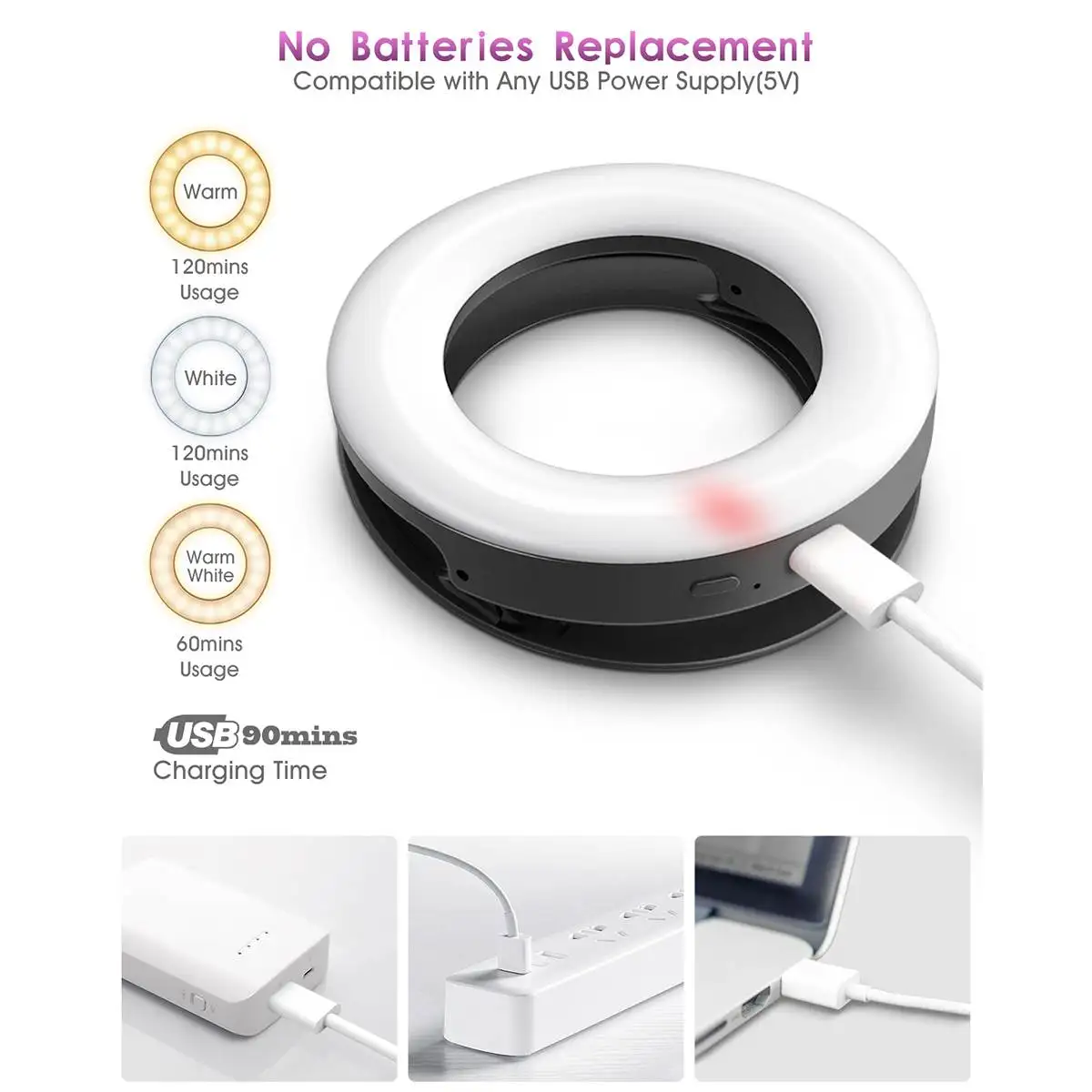 ● [Batterie intégrée de 200mAh]:Mini anneau lumineux portable avec une batterie forte. Vous pouvez l'utiliser pendant presque 2 heures à une luminosité maximale.